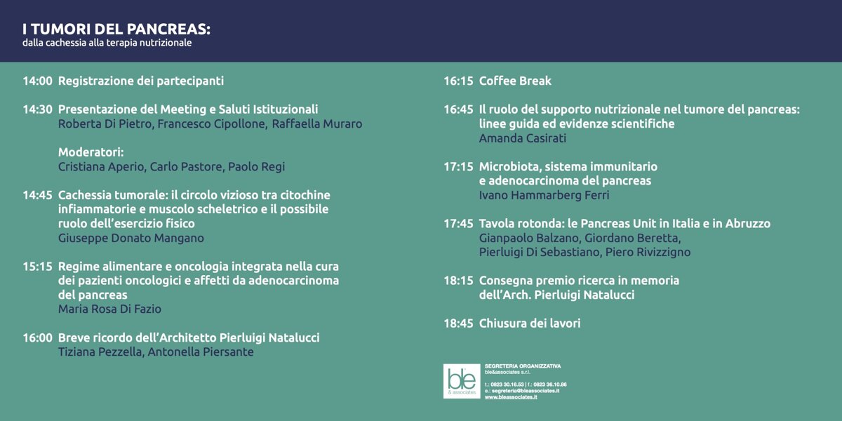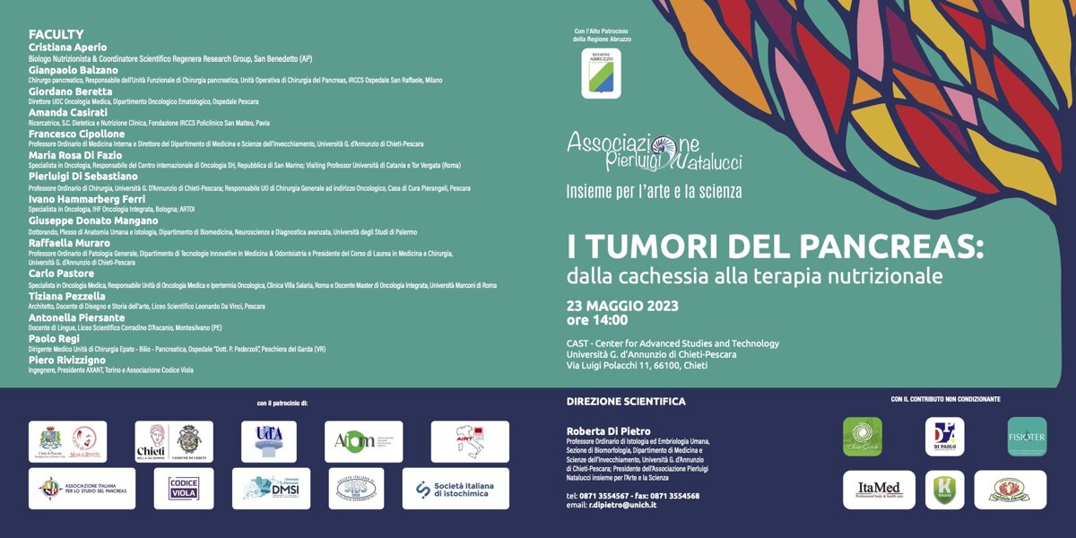 torna in presenza la quarta edizione del Meeting sui Tumori del Pancreas dedicato quest’anno agli effetti della cachessia tumorale e ai benefici della terapia nutrizionale. Il Meeting è organizzato grazie al contributo dell’Associazione Pierluigi Natalucci Insieme per l’Arte e la Scienza, Associazione no profit nata nel gennaio 2018 a seguito della scomparsa prematura del compianto architetto Pierluigi Natalucci, deceduto nell’agosto 2017 a causa di un tumore pancreatico molto aggressivo e non rispondente alla terapia.